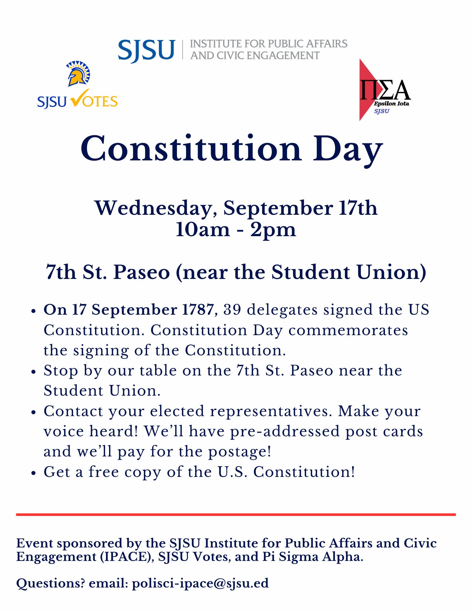 SJSU Votes, the Institute for Public Affairs and Civic Engagement (IPACE), and Pi Sigma Alpha, Epsilon Iota are celebrating Constitution Day with free pocket Constitutions and postcards to contact your elected representatives. We’ll be on the Paseo 10am-2pm. This event is free.
