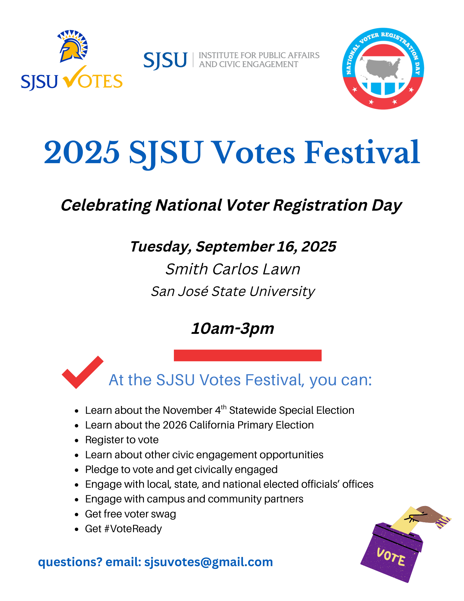 Join SJSU Votes and Partners for the 2025 SJSU Votes Festival Celebrating National Voter Registration Day on Tuesday, September 16 10am-3pm on the Smith Carlos Lawn