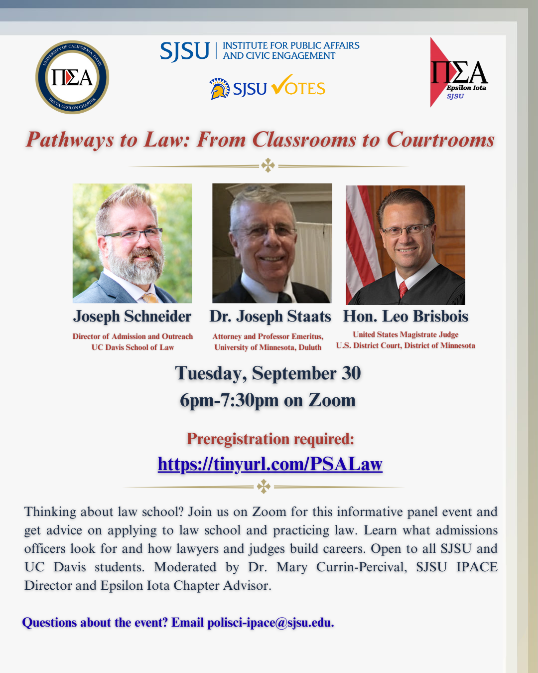 Join SJSU Votes, IPACE, Pi Sigma Alpha SJSU, and Pi Sigma Alpha UC Davis for a Pre-Law Panel Event